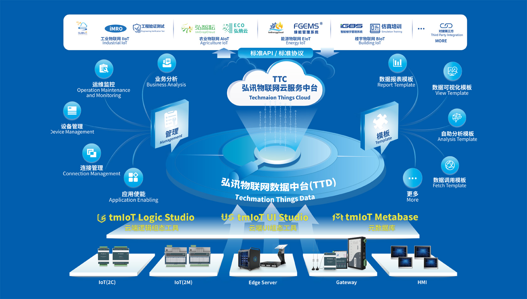 tmloT? 物聯網云平臺,是集自研標準硬件產品、可視化組態工具、數據中臺及多行業開發系統為一體,由弘訊物聯網數據庫統管,形成的AloT生態。